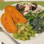 Monday’s Dinner: Sweet Potatoes, Creamed Spinach, Lima Beans, and Salad